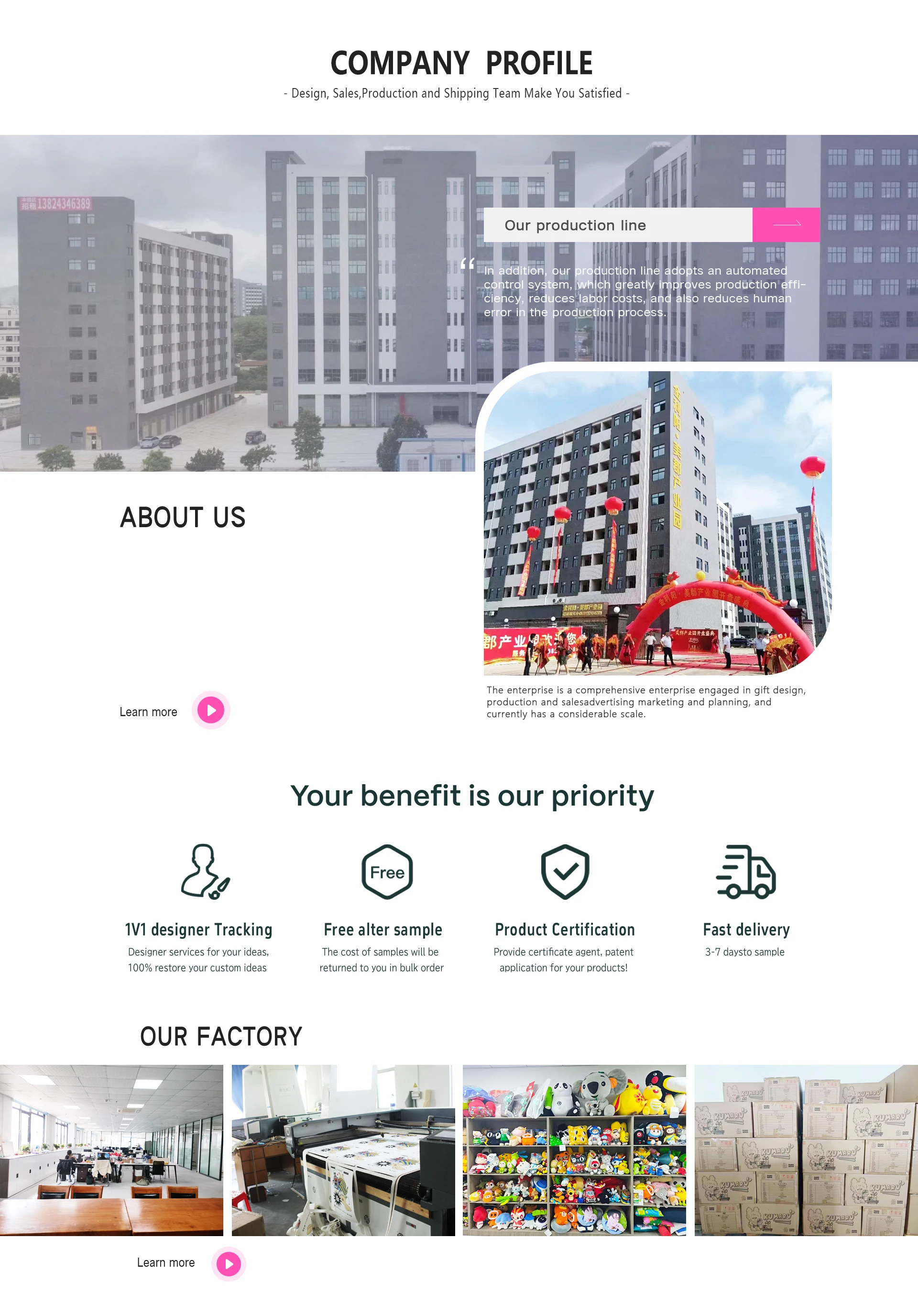 Shenzhen Dacheng Mingde Cultural Supplies Co., Ltd. was established in 2014. ShenzhenDacheng Mingde Cultural Supplies Co., Ltd. is a professional gift enterprise that integratesgift design, development, and production, and is one of the leading companies in the giftindustry. We specialize in the production and sales of fabric products such as gift plush toysmakeup bags, shopping bags, etc. Quality is the foundation of survival, integritymanagement is the core, and strong strength wins customer recognition. Continuouslyproviding customers with more cost-effective, trendy, distinctive, and useful gifts.